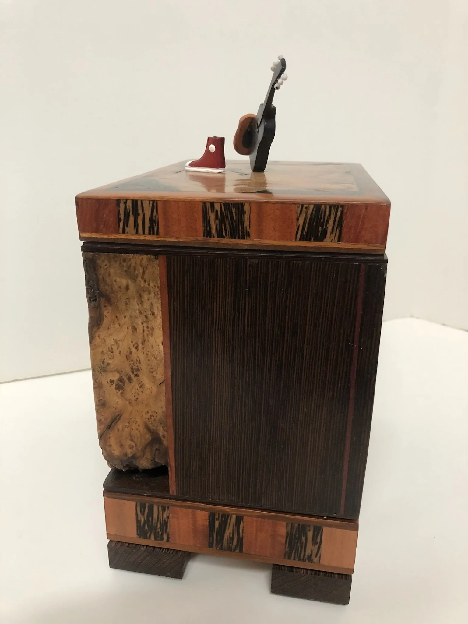 We can stylize an urn to celebrate, memorialize the loved one’s items that they will be remembered for, examples include fedora hat, guitar, red converse shoes.